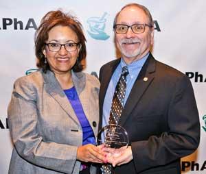 Charlie Broussard receives the 2018 Generation Rx Award of Excellence from 2017–18 APhA President Nancy Alvarez.